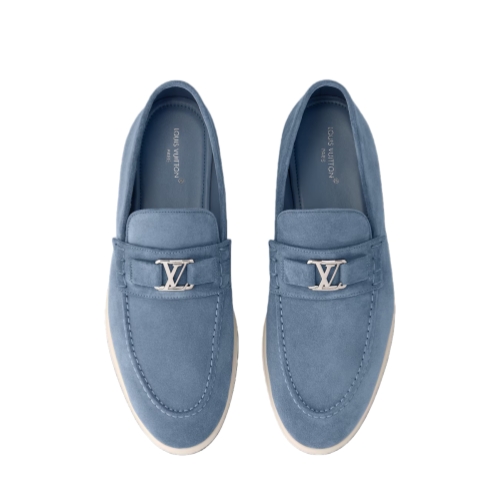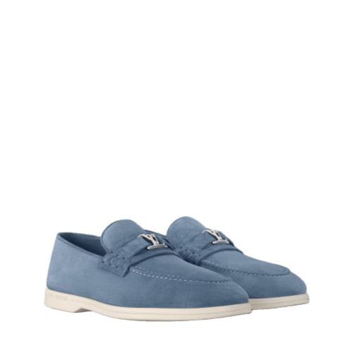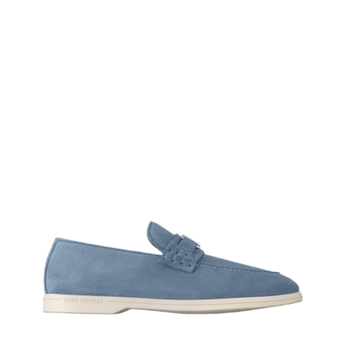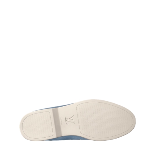 The Estate loafer is revisited this season in suede calf leather for a velvety look and a supple feel. This casual, slip-on style is signed with a metal LV Initials accessory on the strap. It is finished with a contrasting outsole in lightweight micro, which is debossed with the Louis Vuitton signature.