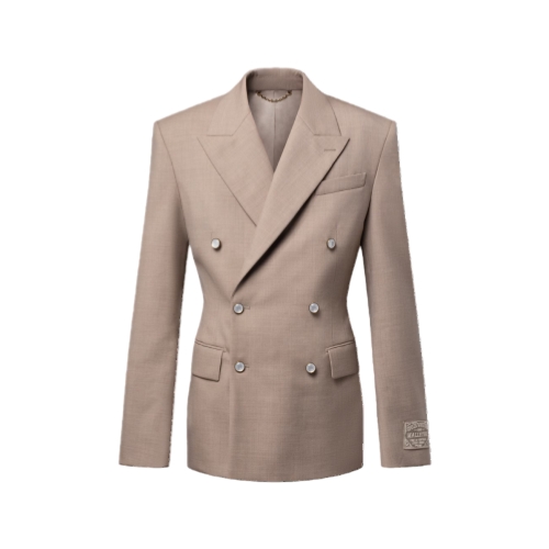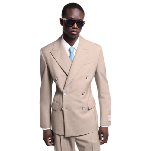 This tailored double-breasted jacket exudes dapper elegance with its fitted waist and wide peak lapel. Tailored from fine, responsibly sourced wool in pale taupe, it is adorned with woven signature labels on the left sleeve, back, and internal hanger loop. Matching drawstring pants make a flowing suit for chic evenings onboard this collection’s transatlantic cruise.