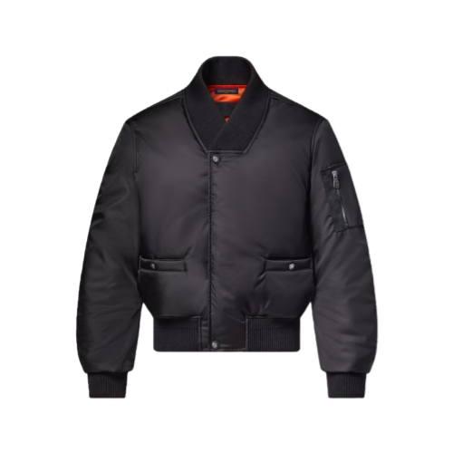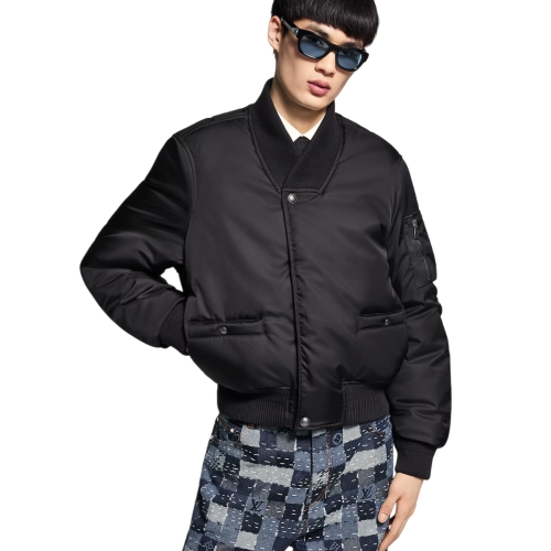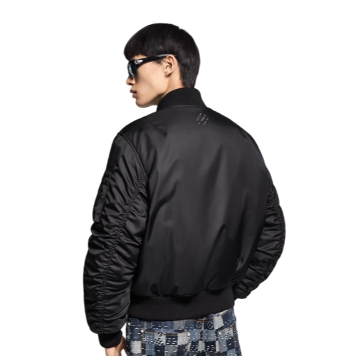 This sleek black flight blouson in a lustrous technical twill is from the Fall-Winter 2025 collaboration between Pharrell and Nigo. Inspired by the Rockabilly movement from Tokyo, it has a cropped silhouette and a modern ribbed Kimono-style collar. Damier grosgrain trim accents the sleeve pocket while a glossy 3D Marque L.Vuitton Déposée signature adorns the back.