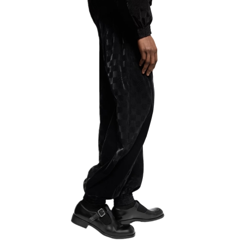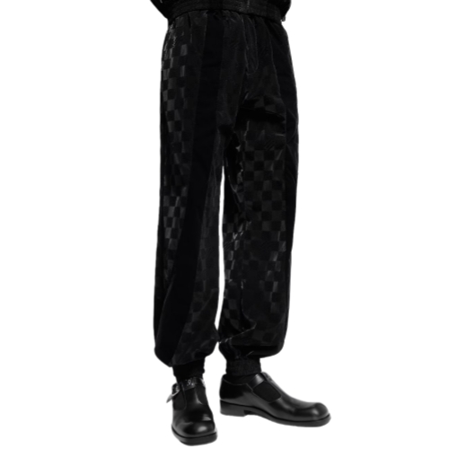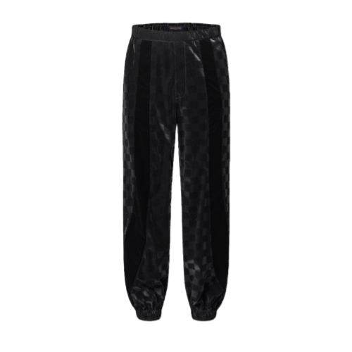 These black track pants from the Spring-Summer 2025 show offer a chic twist on a sportswear classic. The lustrous technical fabric is adorned with a flocked matte Damier motif incorporating Marque L.Vuitton Déposée signatures, while sweeping velvety bands add to the play of textures. Both comfortable and refined, these pants make a sleek travel set paired with a matching top.
