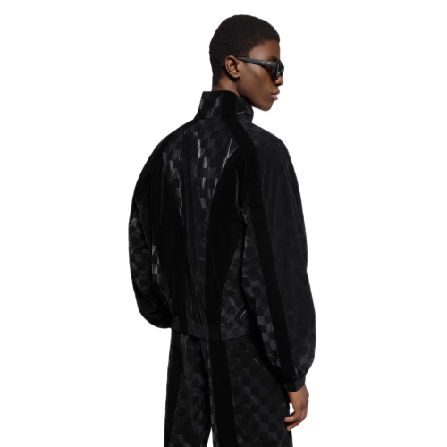This black tracksuit top from the Spring-Summer 2025 show offers a chic twist on a classic sportswear silhouette. The lustrous technical fabric is adorned with a flocked matte Damier motif incorporating Marque L.Vuitton Déposée signatures, while sporty velvety inserts add to the rich play of textures. Matching track pants make a sleek ensemble perfectly suited for travel.