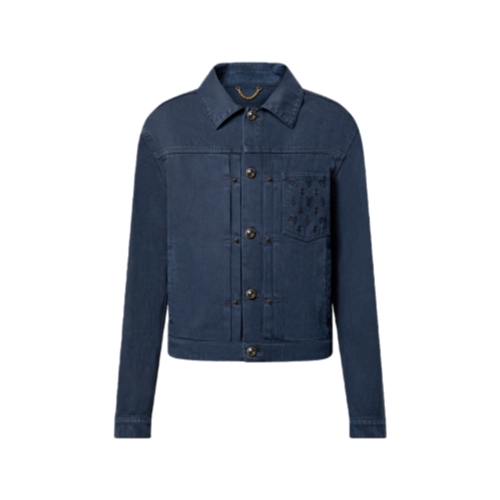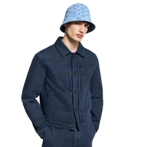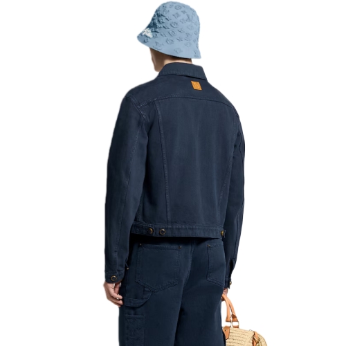 This Type II denim jacket with a classic pleated front is garment-dyed in dark navy with a washed vintage effect. Monogram embroidery adorns the chest pocket, while pearly tonal buttons and rivets lend a sophisticated finishing touch. Matching carpenter pants make a workwear-inspired set.