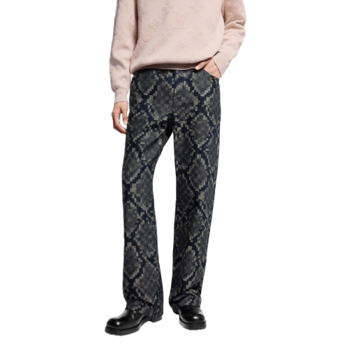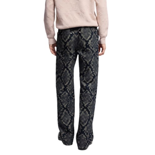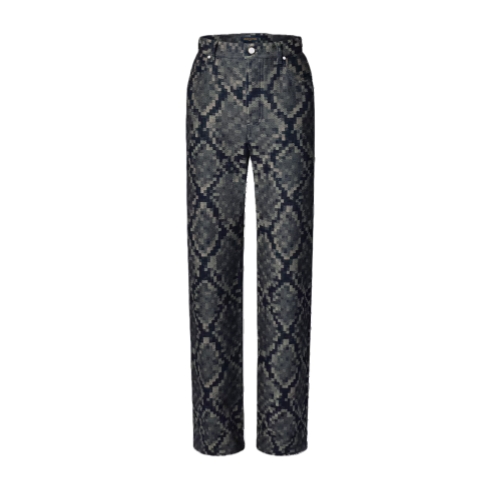 These standout skate pants are cut from this season’s sophisticated Snakoflage denim, which develops the iconic Damoflage into a pixelated snake-inspired jacquard. A Damier jacqueron signs the back of this dandy silhouette, which is adorned with a pearl-effect button and rivets. Paired with a matching collarless jacket these pants offer a fashion-forward twist on the suit.