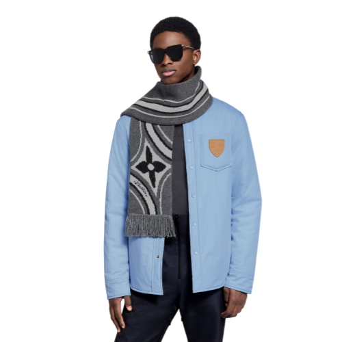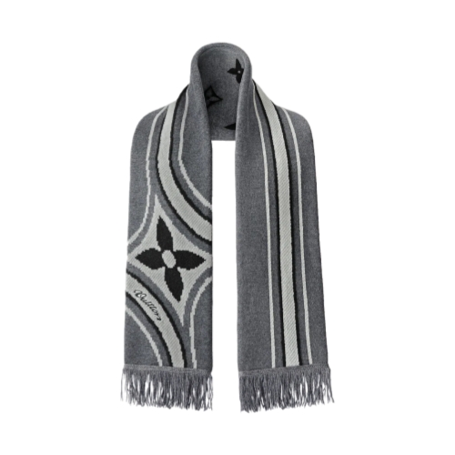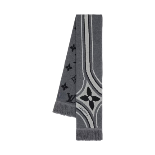 Made in Italy, the graphic flower scarf is a chic, grey design with black and white curved lines and a Monogram Flower. Nestled discreetly inside the design is the cursive "Vuitton" signature from Men's Ready-to-Wear. The wool-blend style is soft and warm, its pleasurable texture enhanced by the plentiful fringes.