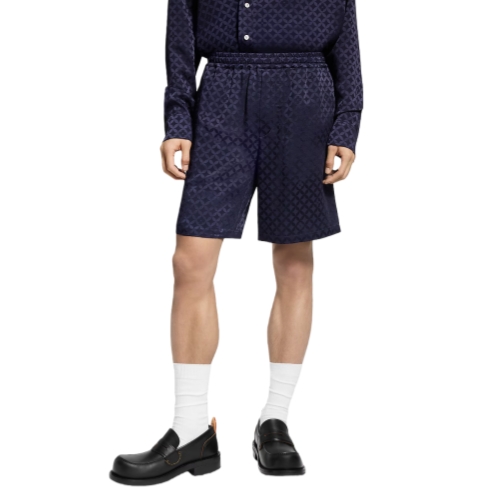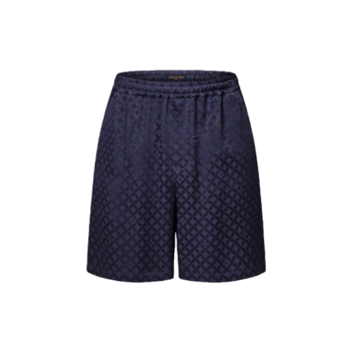 These fluid, dark navy shorts with a comfortable elasticated waist are crafted from lustrous jacquard fabric featuring a tone-on-tone Dandy Monogram motif from the Fall-Winter 2025 collaboration between Pharrell and Nigo. They are signed with a Marque L.Vuitton Déposée patch above the rear pocket. A perfect buy-now-wear-now piece for warm weather, these shorts have a matching short-sleeved shirt for an effortlessly chic day-to-evening look.