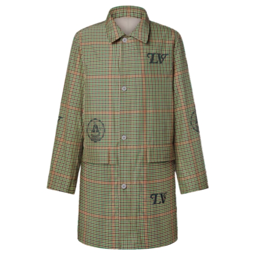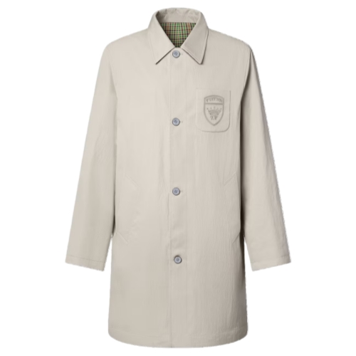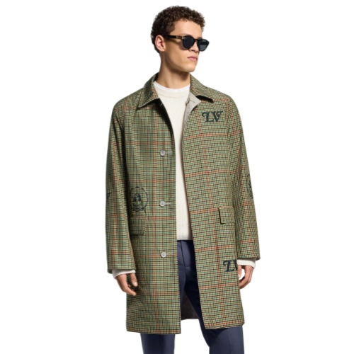 This light, reversible raincoat is a versatile transeasonal piece that can be styled in multiple ways. It has an elegant plain pale beige side adorned with a richly embroidered chest pocket with signatures inspired by this collection’s university crests. On the other side it becomes a fashion-forward layer sporting a colorful tartan jacquard over-printed with graphic signatures.