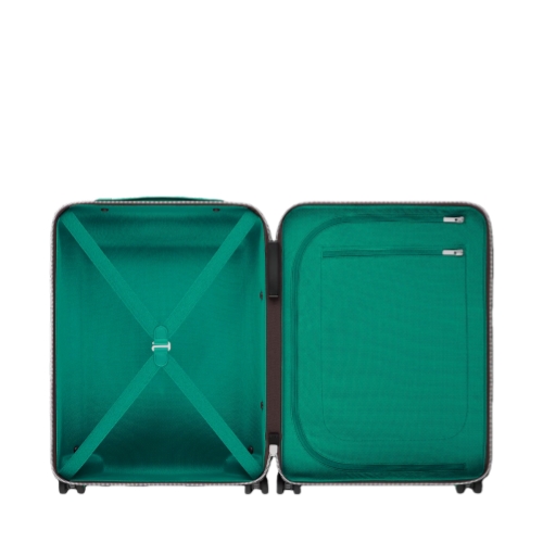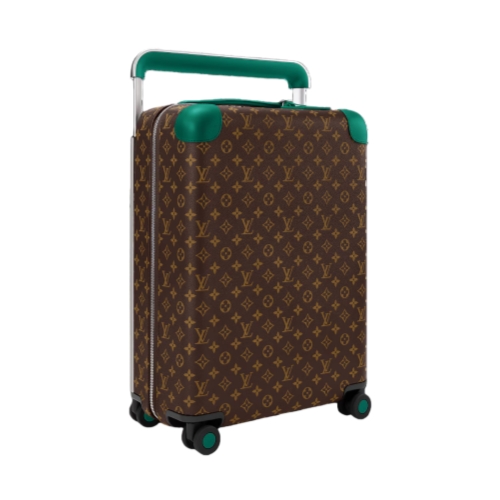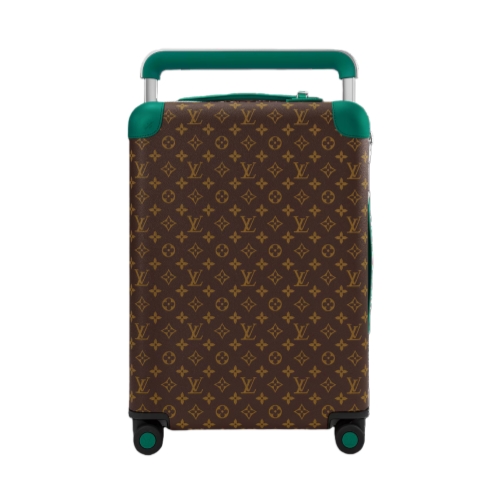This Horizon 55 rolling suitcase in Monogram Macassar canvas, with touches of vibrant color on the reinforced corners, cane handle, and its compact wheels, is small enough to carry onto a plane. And yet its interior is remarkably roomy thanks to its external cane. The lining is in the same bright color as the exterior details.