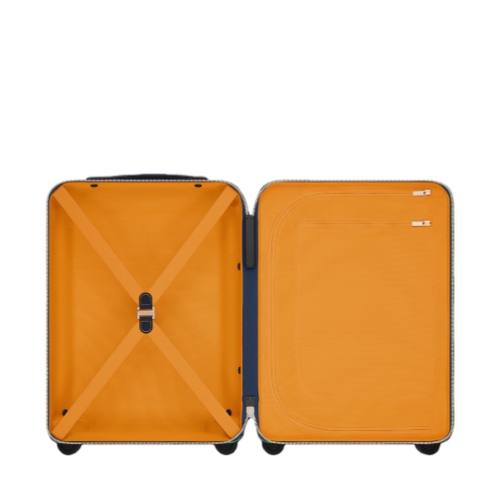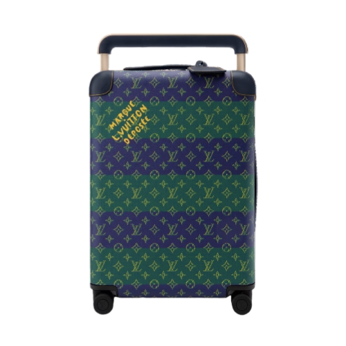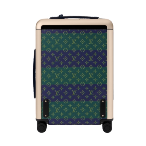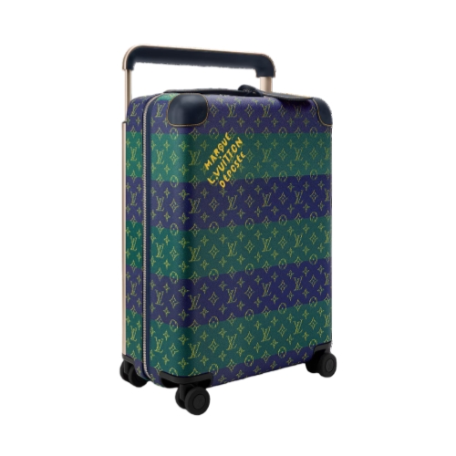 The Horizon 55 rolling suitcase is crafted from Monogram Heritage coated canvas in a striped colorway inspired by classic rugby jerseys. Navy-blue trim and champagne-toned hardware lend a refined touch. The spacious carry-on interior is lined in bright saffron. The historic “Marque L. Vuitton Déposée” signature, embraced by Pharrell Williams, signs the piece.