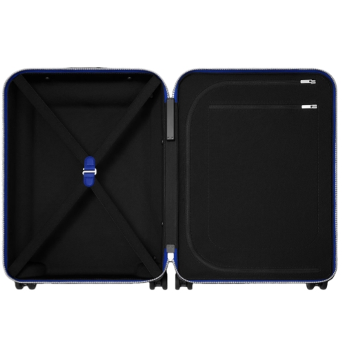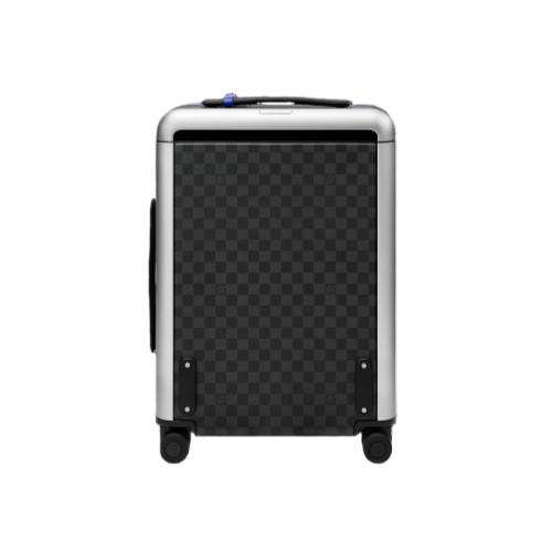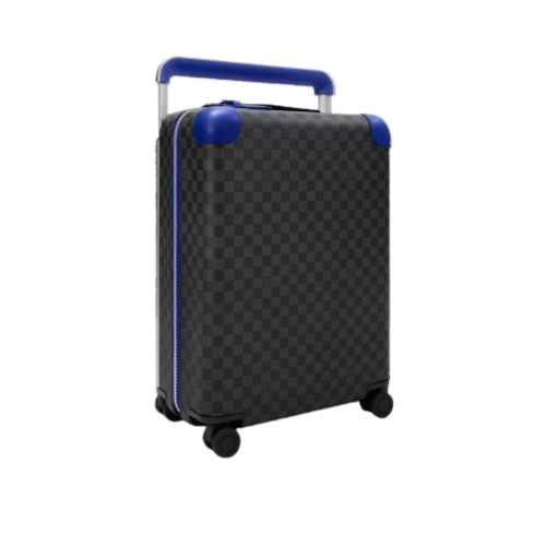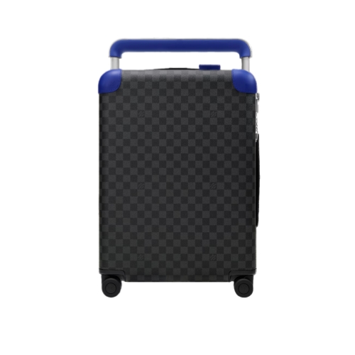 This Horizon 55 rolling suitcase is fashioned from Damier Graphite canvas with indigo-blue leather on the corners and the cane handle. The bright blue accents bring a fresh feel to the iconic checkerboard pattern. The Horizon’s trolley system is placed on the exterior, making this carry-on bag unexpectedly roomy inside.