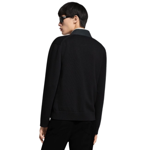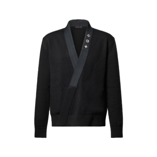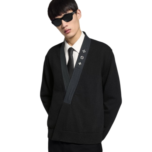 This black wool cardigan is from the Fall-Winter 2025 collaboration between Pharrell and Nigo. It features a lightly quilted cotton Kimono-style collar inspired by Nigo’s Japanese roots, which is embellished with three Monogram Flower patches with a delicate pearly luster. A concealed button fastening creates an elegant, pared-down silhouette that can be styled with casual and formal looks.