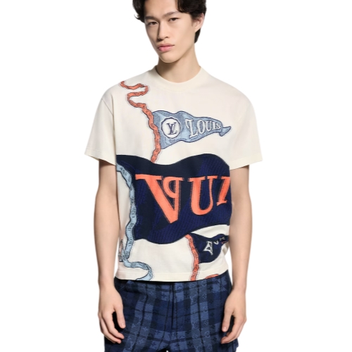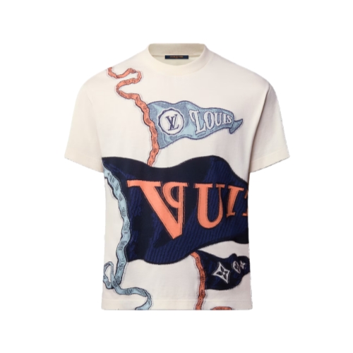 This graphic white cotton T-shirt is adorned with this collection’s LV Club Flags motif inspired by the insignia of college sports teams. The sophisticated jacquard knit features three blue pennants adorned with House signatures, while a woven Marque L.Vuitton Déposée patch signs the back. This casual piece brings a fashion-forward accent to everyday looks.