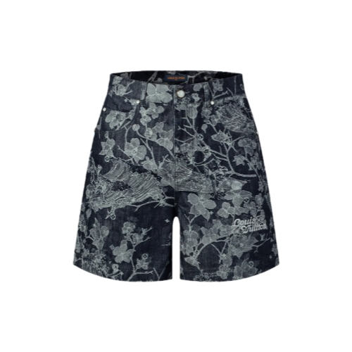 These denim shorts are elevated with a sophisticated woven jacquard motif featuring tropical blooms and surf imagery overprinted with Monogram signatures. An embroidered Louis Vuitton adorns the left leg, while a pearly button and rivets lend further sophistication to this casual piece. A matching shirt makes a standout look.