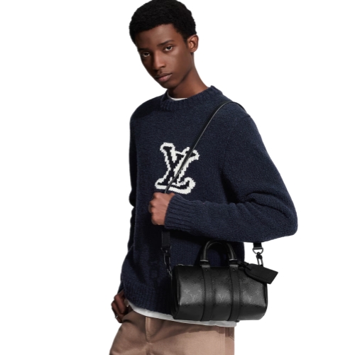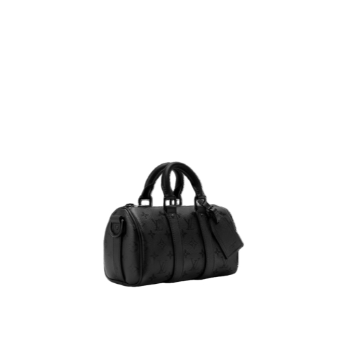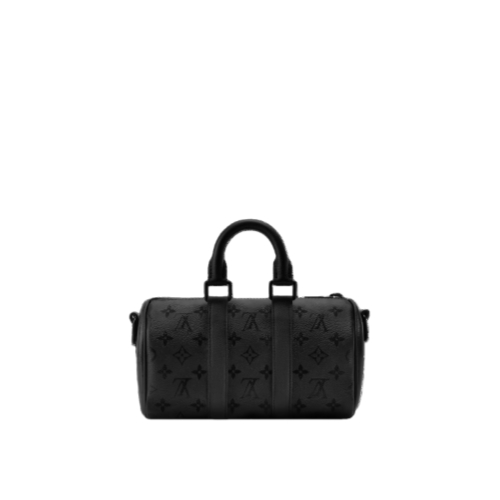 The Keepall Bandoulière 25 exudes sleek confidence in Monogram Midnight coated canvas, accented by a dark tone-on-tone Monogram print. This compact city bag features black leather trim and a matte-black zipped closure. Alongside its top handles, a wide, removable textile strap adjusts for comfortable cross-body or shoulder carry.