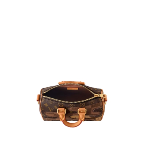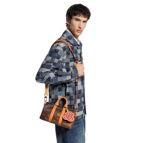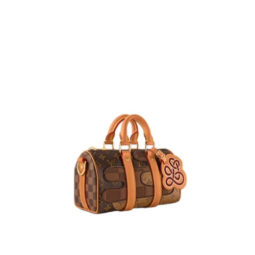The Keepall Bandoulière 25 city bag is crafted from a combination of Monogram and Damier canvas, creating a motif evocative of an abstract landscape. Inspired by the Japanese boro technique of repeatedly patching fabric, Damier and Monogram patches are embroidered on top of the House’s iconic brown Monogram canvas.