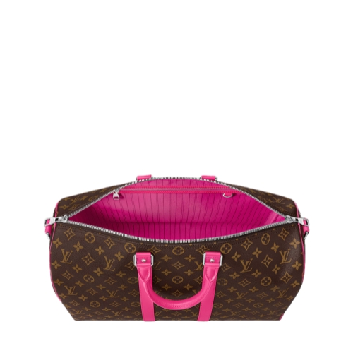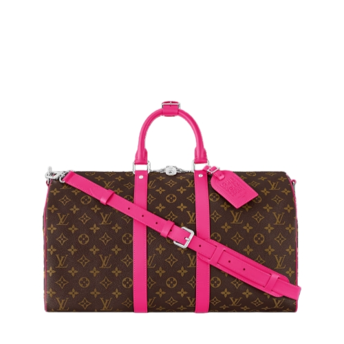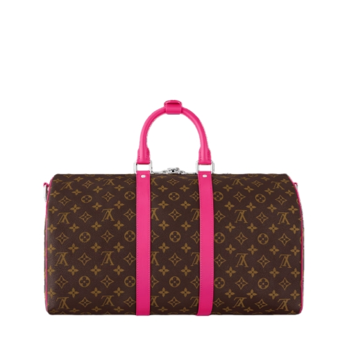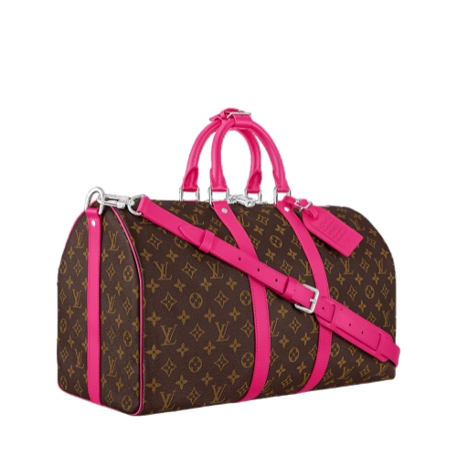 The Keepall Bandoulière 45 bag is made from Monogram Macassar coated canvas with colorful leather trim, as part of the second chapter of the LV Colormania collection. The touches of color on the leather side bands, top handles, removable name tag, and detachable shoulder strap bring sophistication to this classic travel bag.