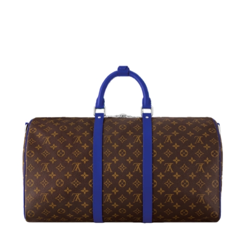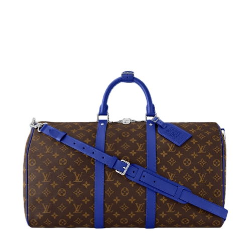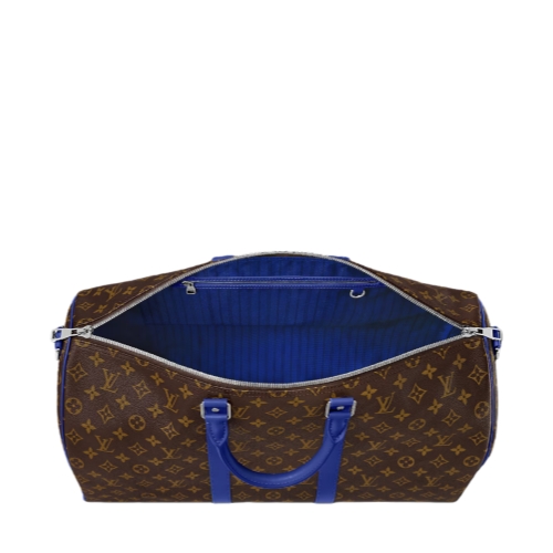 Brightly colored leather details bring a fresh feel to this Keepall Bandoulière 50 travel bag in Monogram Macassar canvas. The top handles, the removable shoulder strap, even the leather name tag, are all in the same bright color. The bag is lined in a striped textile inspired by the linings of the House’s original trunks.