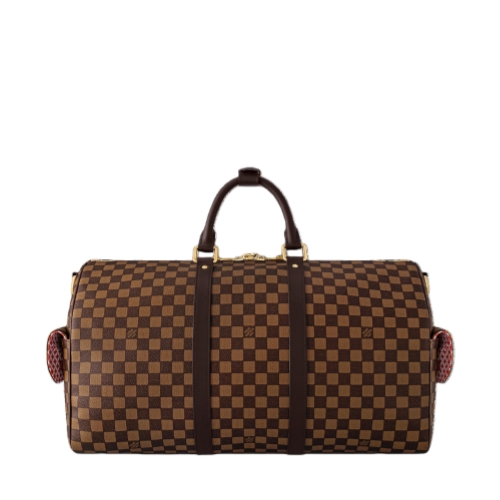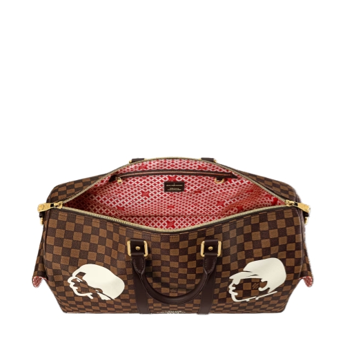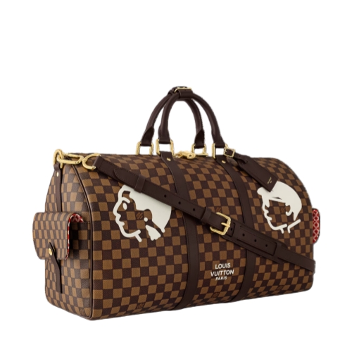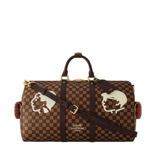 This reimagining of the classic Keepall Bandoulière 50 in Damier Phriendship canvas features pockets with flap closures at either end of the bag. Celebrating the decades-long collaboration with Japanese designer Nigo, Pharrell Williams prints their portraits on Damier Ebene canvas. The leather trim and the striking pattern of the lining complete the elegant design.