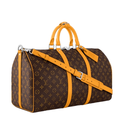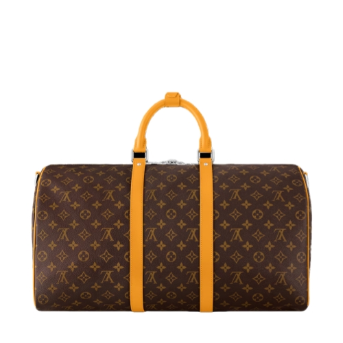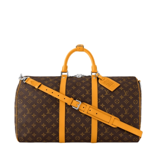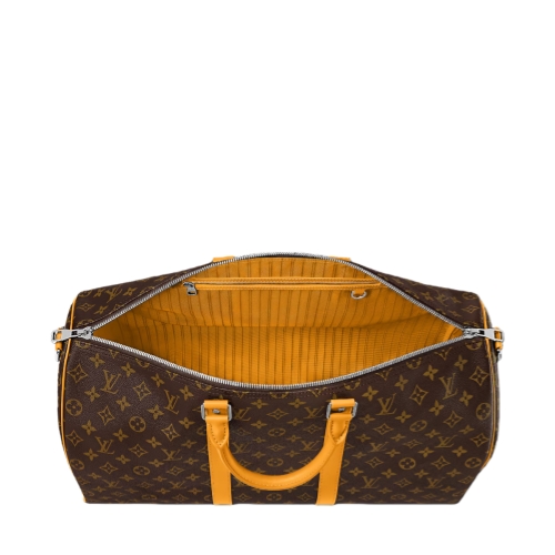 Brightly colored leather details bring a fresh feel to this Keepall Bandoulière 50 travel bag in Monogram Macassar canvas. The top handles, the removable shoulder strap, even the leather name tag, are all in the same bright color. The bag is lined in a striped textile inspired by the linings of the House’s original trunks.