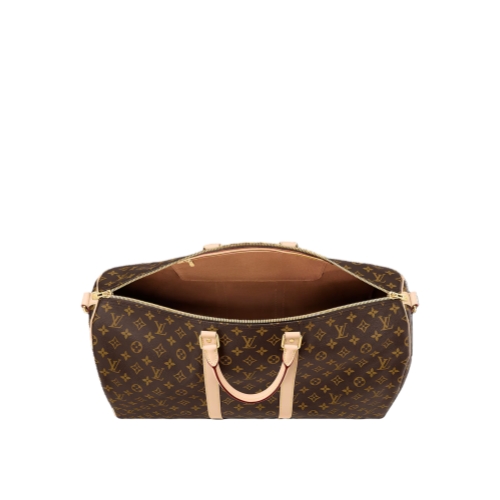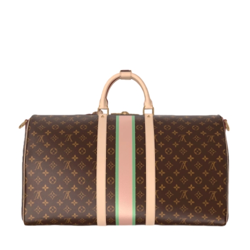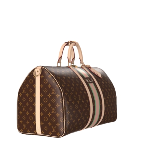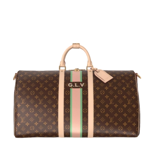 The classic Keepall Bandoulière 55 in Monogram canvas is customizable as part of the Mon Monogram offer and can be personalized with colorful stripes, patches, and initials. Iconic since its appearance in 1930, the Keepall embodies the House’s approach to travel. A roomy interior, rolled-leather top handles, and a removable shoulder strap make it practical.