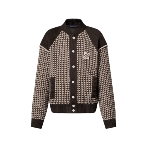 This cotton bomber from the Spring-Summer 2025 show features a chunky LV Stitch jacquard in brown tones resembling miniature LVs. Dark brown ribbed accents frame this piece, from the collar and raglan shoulders to the pockets. A Marque L.Vuitton Déposée patch signs the chest while pearl-effect buttons add a dandy twist. Casual yet refined, this buy-now-wear-now piece is perfect for layering as the seasons transition.