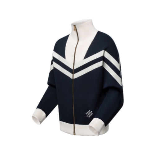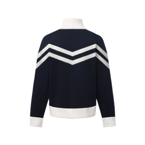 This knitted nautical cotton blouson takes a sporty silhouette into new territory with its finely crafted details. White bands create a contemporary motif inspired by sailor’s uniforms across the upper body and arms, while the shoulders are enhanced with a textured Epi-effect jacquard. A tall ribbed collar keeps out sea breezes, while a contrasting embroidered signature adds a smart finishing touch to this casual yet elegant piece.