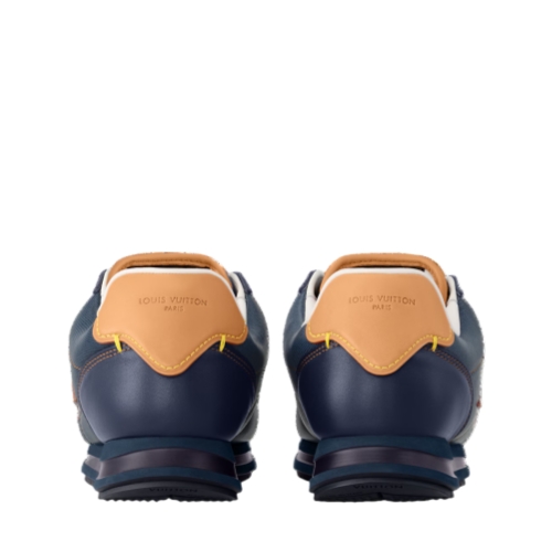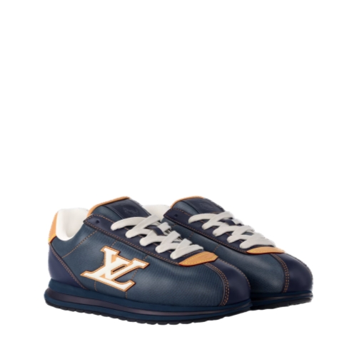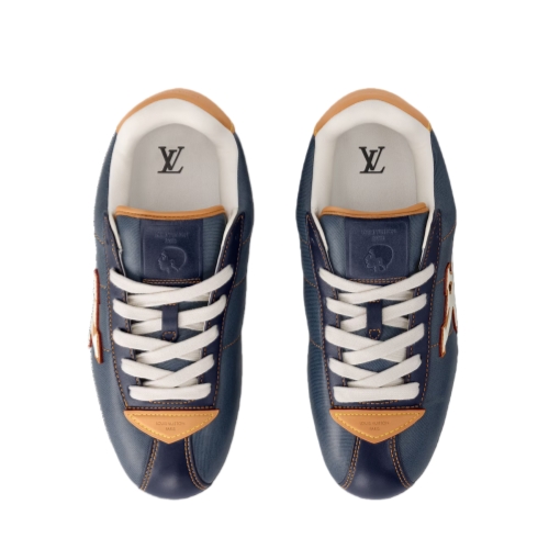 This edition of the LV BUTTERSOFT Sneaker comes in lambskin and calf leather with a denim effect. Designed by Men's Creative Director Pharrell Williams, this model takes its name from the ultra-soft feel of the leather, which is enhanced by the padded upper, expertly stitched by Louis Vuitton artisans. The upper is complemented by natural leather trim, inspired by the leather goods, an LV Initials signature and embossed motifs of Pharrell Williams' profile and a lobster, referencing the Fall-Winter 2025 men's show.