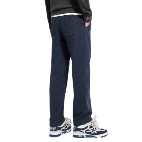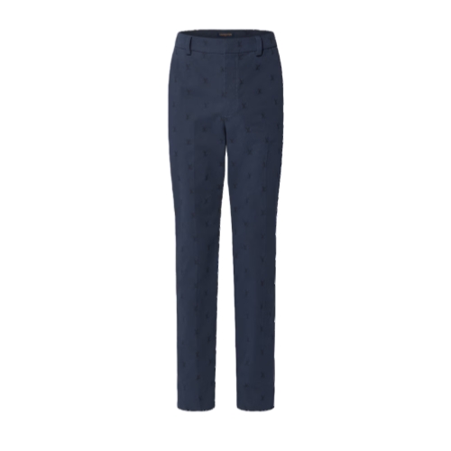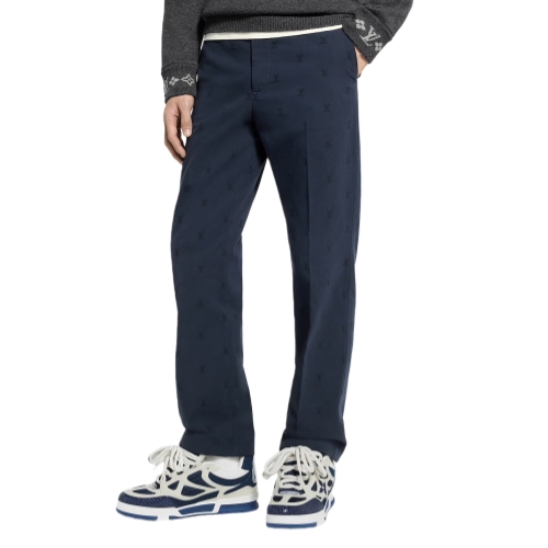 These timeless navy blue cotton chinos are distinguished with an allover tonal LV Blason jacquard and signed with a ‘Marque L.Vuitton déposée’ embossed leather tag on the back pocket. With their elegant silhouette, these pants can be worn as a contemporary suit with a matching tailored jacket.