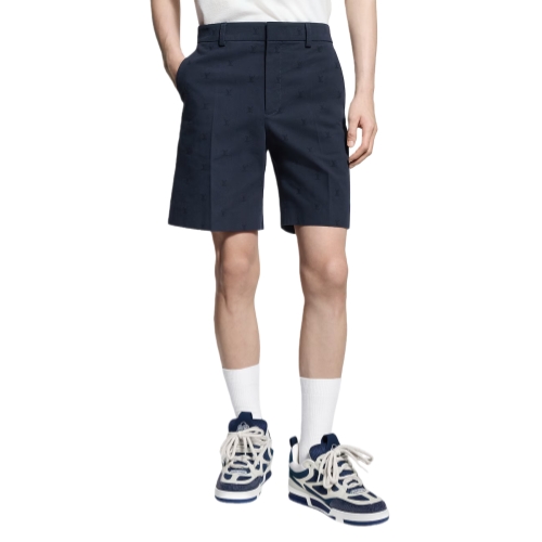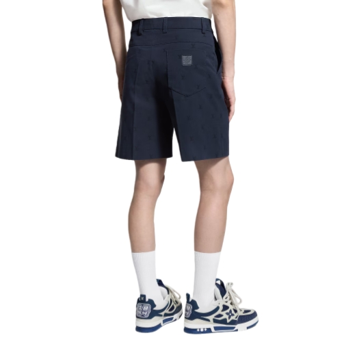These classic navy blue cotton chino shorts are perfect for warmer spring weather. They are distinguished with an allover tonal LV Blason jacquard and signed with a ‘Marque L.Vuitton déposée’ embossed leather tag on the back pocket. These shorts can be worn with a matching tailored jacket for a modern and elegant look.
