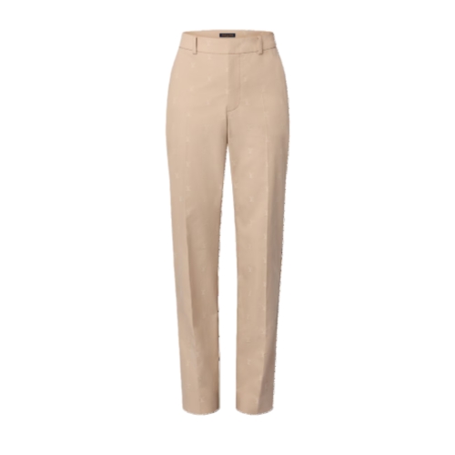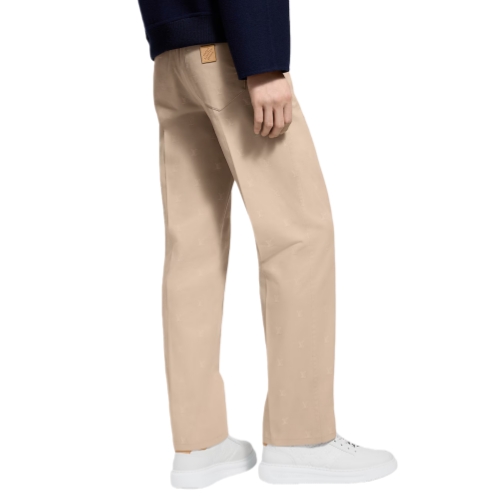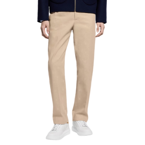 These timeless beige cotton chinos are distinguished with an allover LV Blason in a tonal jacquard and signed with a ‘Marque L.Vuitton déposée’ embossed leather tag on the back pocket. With their elegant silhouette, these pants can be worn as a contemporary set with a matching blouson.