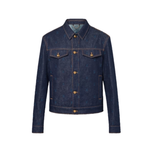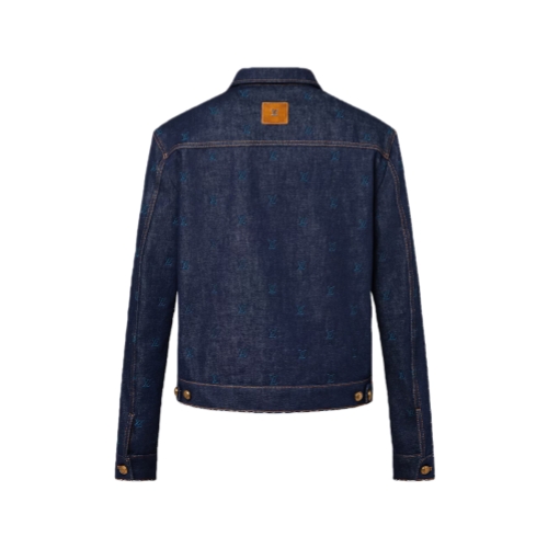 This transeasonal denim jacket is elevated with an allover LV Blason motif embroidered in tone-on-tone yarn. The classic trucker silhouette is constructed from raw-washed dark indigo denim with contrasting topstitching and bronze-colored buttons. A Damier nubuck label at the back with a metal LV ornament adds a chic finishing touch to this distinguished piece, which has matching pants.