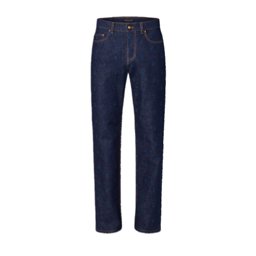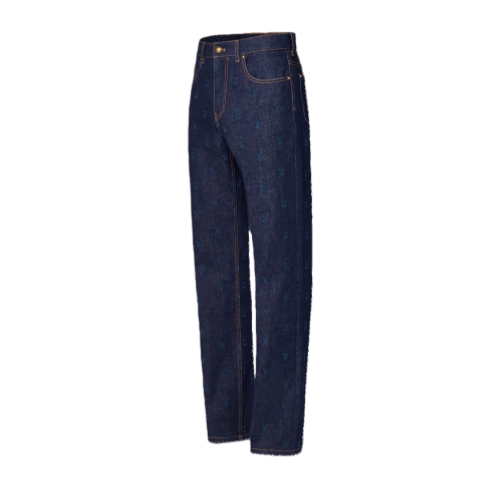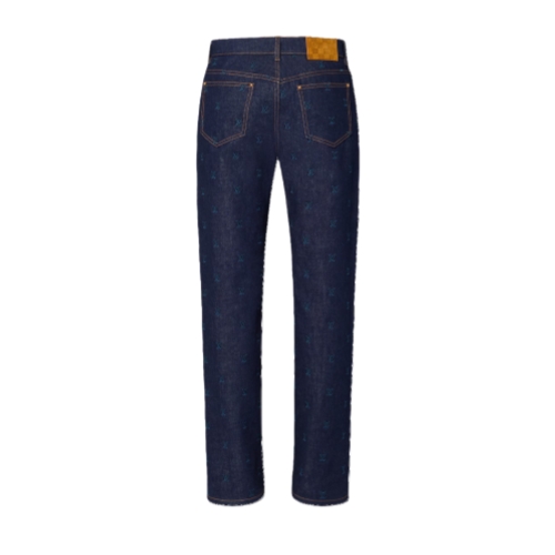 These transeasonal denim pants are elevated with an embroidered allover LV Blason motif in tone-on-tone yarn. The classic jeans silhouette is constructed from raw-washed dark indigo denim and signed with a Damier nubuck jacqueron adorned with a metal LV ornament. These pants make a distinguished set paired with a matching jacket.