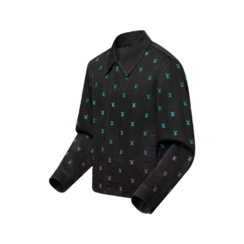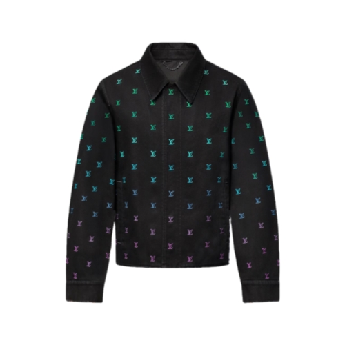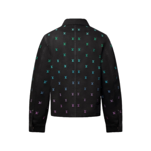 Crafted in washed black denim, this casual coach jacket is elevated with an allover embroidered LV Blason motif in a sophisticated gradient treatment, with pop colors fading from aqua to shades of green, blue and violet. Matching skate pants make a graphic total look.