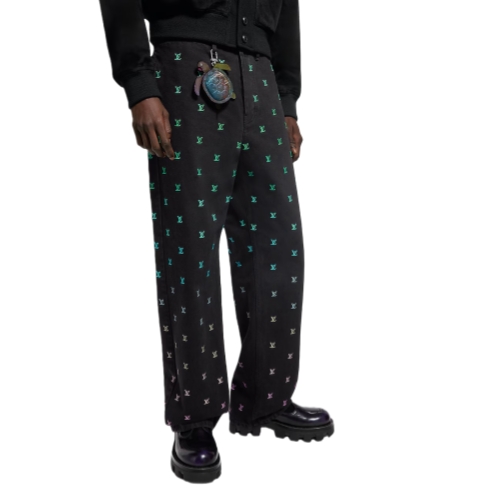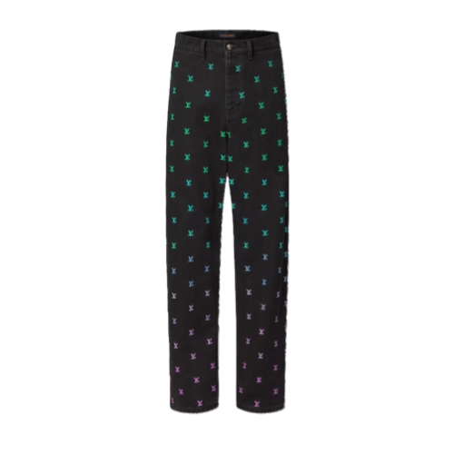 Crafted from washed black denim, these relaxed skate pants are adorned with an embroidered allover LV Blason motif in this Spring collection’s sophisticated gradient theme, with pop colors fading from aqua to shades of green, blue and violet. An eye-catching casual style that brings a dynamic signature accent to a look.