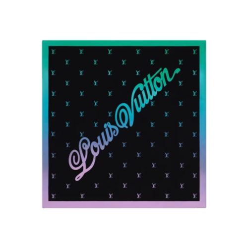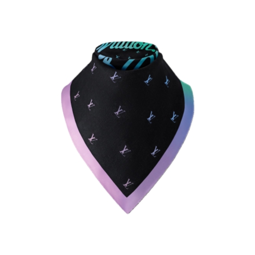 The LV Blason Shading Bandana takes a classic black style and gives it a charming twist. The pure silk piece is printed with the initials in repeat, freshened up in a shaded gradient of greens, blues, and purples, with a matching, solid border and the House name written in the center. This is an unforgettable style.