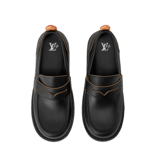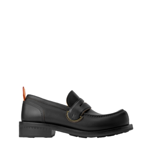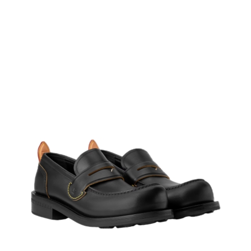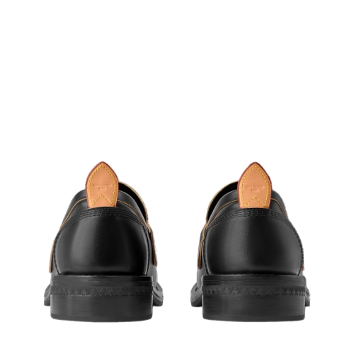 The LV Bubble loafer in calf leather combines the Japanese workwear aesthetic of the Fall-Winter 2025 men's show with details inspired by the heritage of Louis Vuitton: the strap on the upper is shaped like a trunk handle, while the natural leather back tab and yellow stitching reference the leather goods. This model is finished with a sturdy rubber outsole.