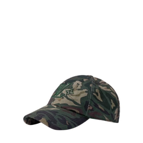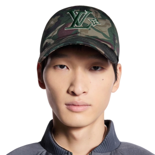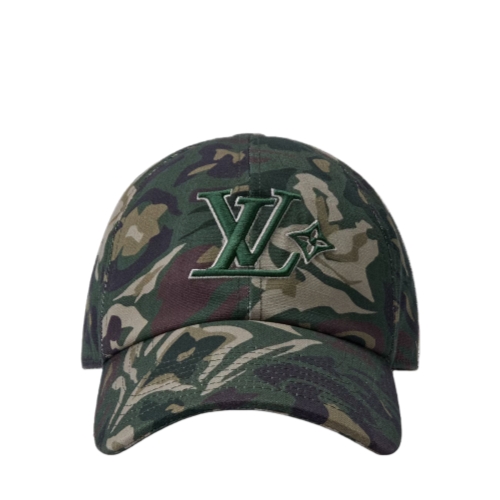 Made in Italy, the LV Camo cap is an enigmatic interpretation of the concealing print, updated and heightened with distorted Monogram Flowers. The front panels of the lightweight cotton hat are embroidered with the LV Flower signature, and an adjustable snap back features the LV Vers signature.
