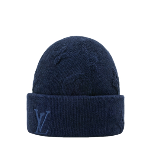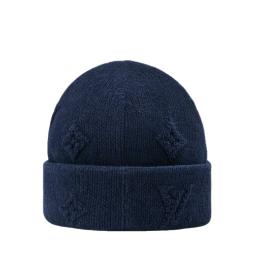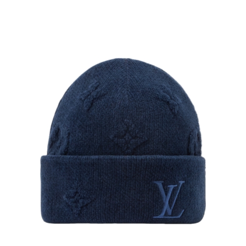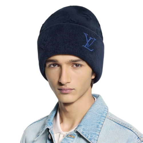 The LV Crush Monogram Heritage beanie makes it a pleasure to face cold temperatures. The warm, cotton-blend hat is knit with an innovative technique that renders the Monogram motif in vivid, 3D form, creating a distinct and discreet texture and depth. An oversized pair of embroidered initials serves as the finishing accent.