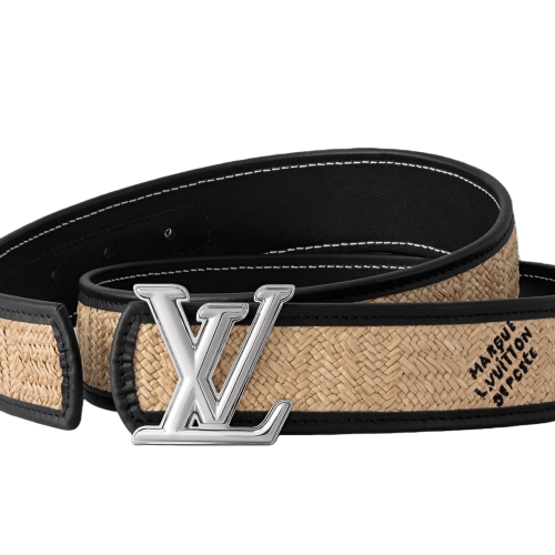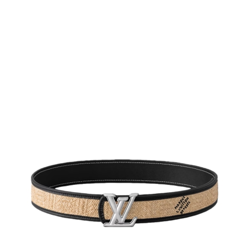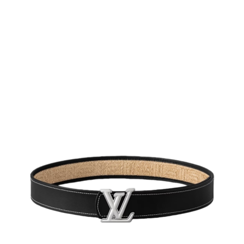 The LV Dimension Raffia 40mm Reversible Belt translates the beloved design elements of the original series into a summer-ready style. On one side of the strap, woven raffia in a natural beige, featuring the embroidered "Marque L.Vuitton Deposée" signature, gives texture that smartly juxtaposes the smooth black leather of the reverse.