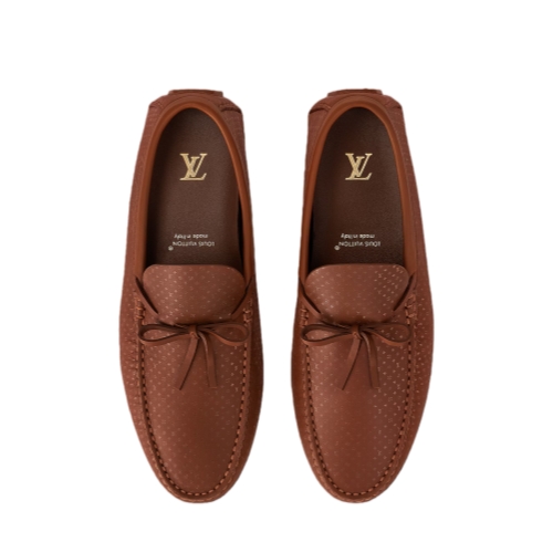 This seasonal edition of the LV Driver moccasin is crafted from supple calf leather discreetly embossed with a miniature version of the Louis Vuitton Monogram pattern. This car shoe has a hand-stitched vamp and a tubular construction for comfort and lightness, both testaments to the House's shoemaking know-how. It is finished with a flexible rubber-pad outsole.