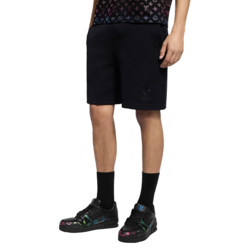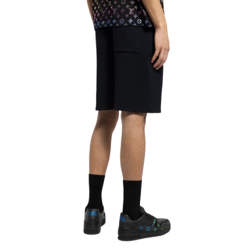Crafted in a refined wool-cotton blend jersey, these black shorts with a soft ribbed waist embody this collection’s effortless elegance. The relaxed silhouette is elevated with a tone-on-tone iridescent rhinestone LV signature on the bottom left leg. Easy to mix and match with casual looks, this versatile style also makes a perfect summer travel set with a matching t-shirt.