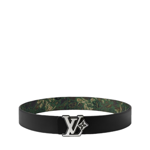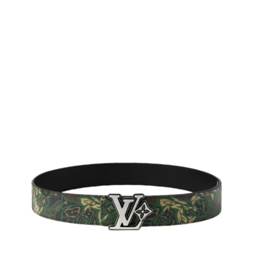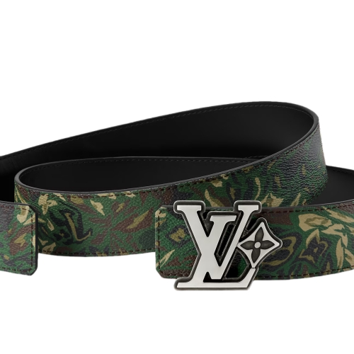 The LV Flower Camoflage 40mm Reversible Belt is a clever reinterpretation of the masculine motif long favored by outdoorsmen. The muted palette is transformed into a blend of swirled shapes and House signatures. As a sleek alternative, the reverse is crafted from black leather. The silver-toned buckle with the floral signature suits both fashion-forward options perfectly.