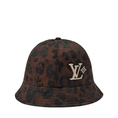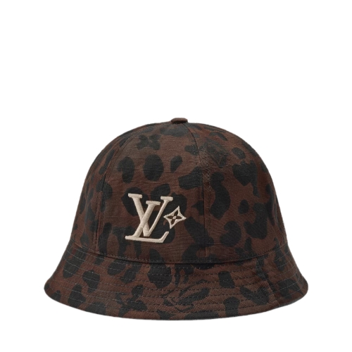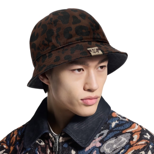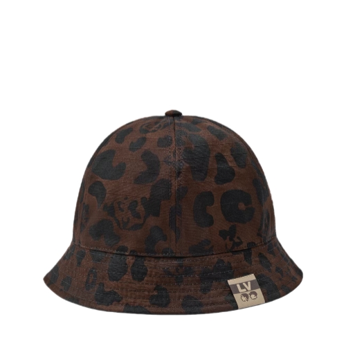 The LV Leo Reversible Bucket Hat is a lightweight style with an expressive mix of the classic and the contemporary. Made in Italy, the 100% cotton piece boasts, on one side, a brown leopard pattern and Pharrell Williams and Nigo's portraits in white, and on the other, a solid brown with the LV Flower signature.