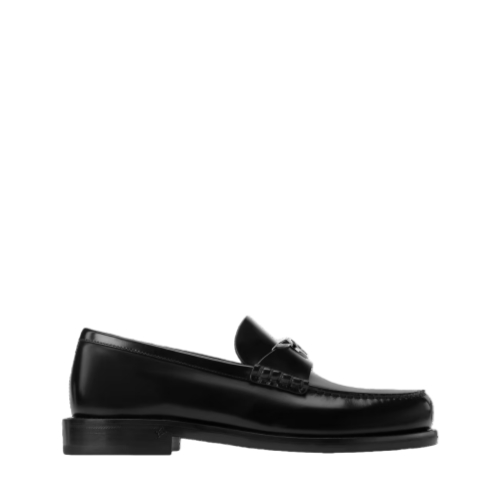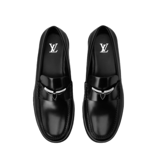 The LV Oxford loafer in glazed calf leather is a modern interpretation of a classic style. Its key detail is a silver-toned accessory in the shape of a half Monogram Flower, which was inspired by the iconic Capucines bag and is engraved with the Louis Vuitton signature. This model is finished with a durable leather and rubber outsole.