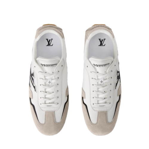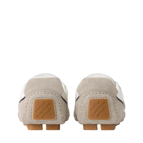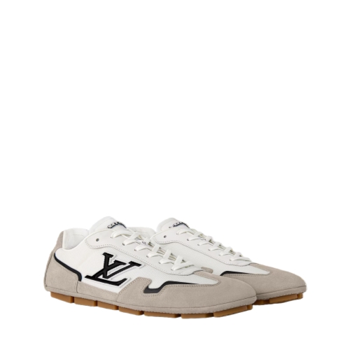 This two-tone version of the LV Rally sneaker combines suede calf leather with technical mesh for a modern look. This streamlined model has a car-shoe construction, with a rubber-pad outsole, for a light, supple feel. The upper features a dynamic LV Initials signature on the side and the Marque L. Vuitton déposée logo at the back.