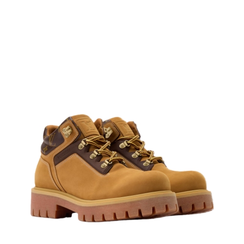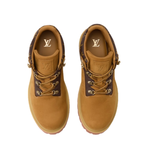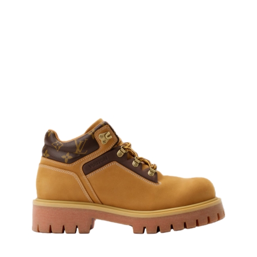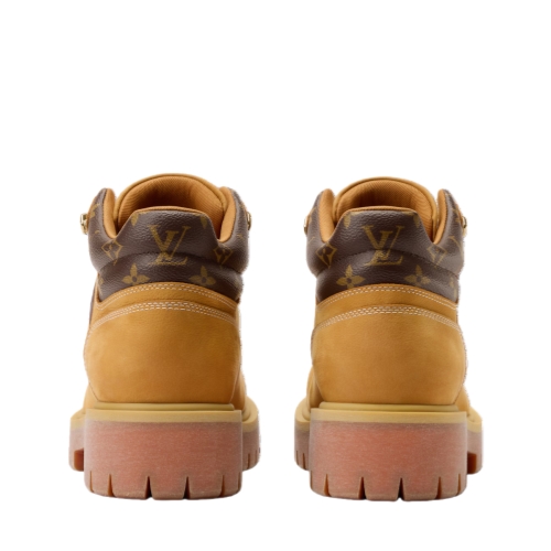 This edition of the LV Remix ankle boot pairs soft nubuck calf leather with Monogram trim on its comfortable, padded collar. Inspired by both workwear and classic hiking boots, this model combines functionality with refined details, such as two-tone laces, gold-toned lace hooks and a chunky rubber outsole with House signatures on the tread.