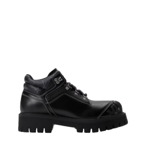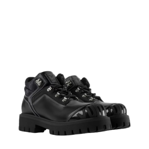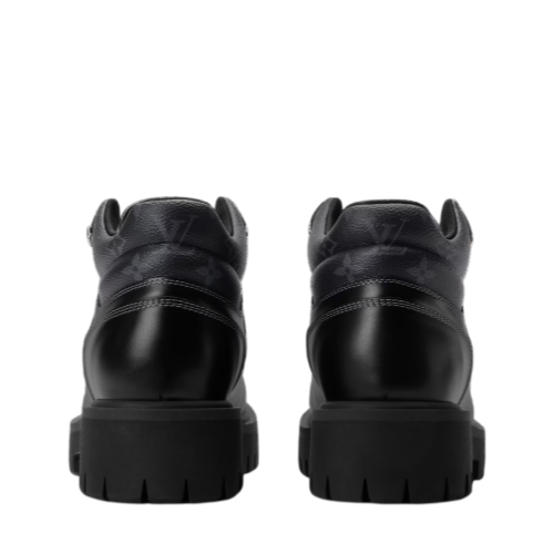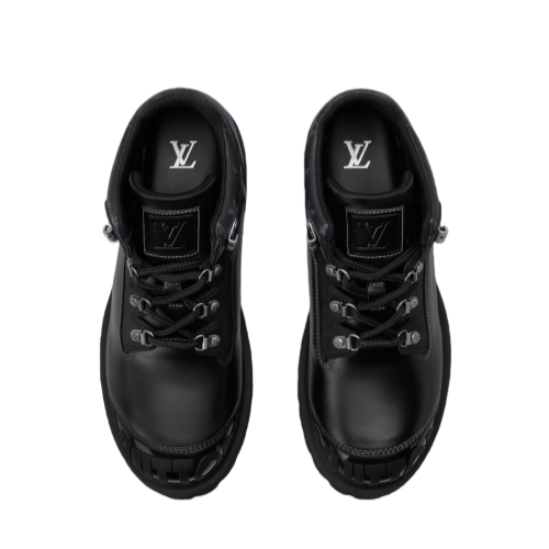 The LV Remix ankle boot in smooth calf leather fuses workwear and hiking influences. This model is notable for its rich detailing, including Monogram trim on the padded collar and a rubber toe cap with the Vuitton signature. Contrast stitching and engraved lace hooks further elevate this design, which is finished with a chunky rubber outsole.