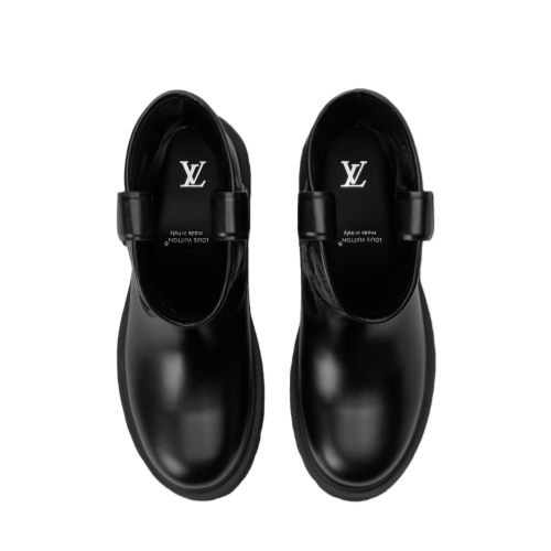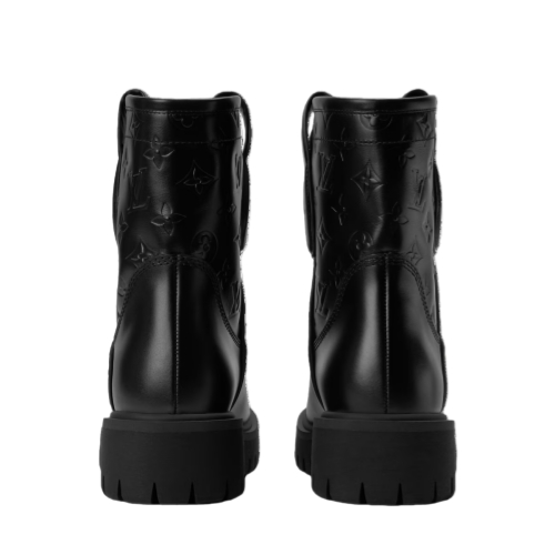 The LV Remix ankle boot comes in smooth calf leather, which on the shaft is embossed with the Monogram pattern. Influenced by workwear, this model combines functionality with fashion appeal. The upper is complemented by refined details, such as a Louis Vuitton-embossed pull-on strap, while the chunky rubber outsole features House signatures on its tread.