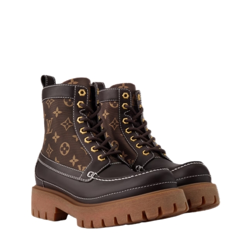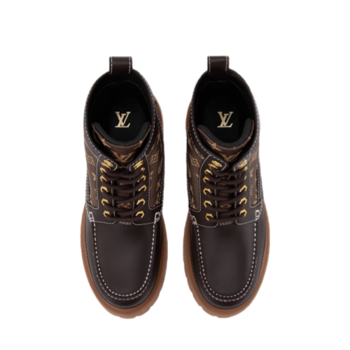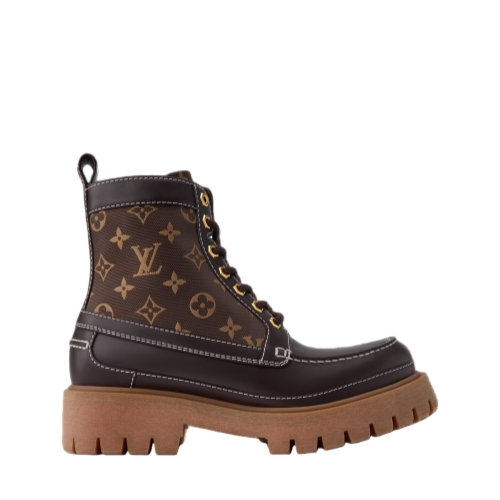 The LV Remix ankle boot combines Monogram jacquard with smooth calf leather. This rugged style, inspired by hiking boots, is notable for its chunky, treaded outsole in extremely lightweight rubber. The design is elevated by refined details, such as gold-toned eyelets and white stitching, which gives this model a subtle vintage look.