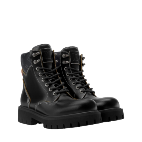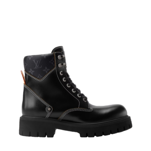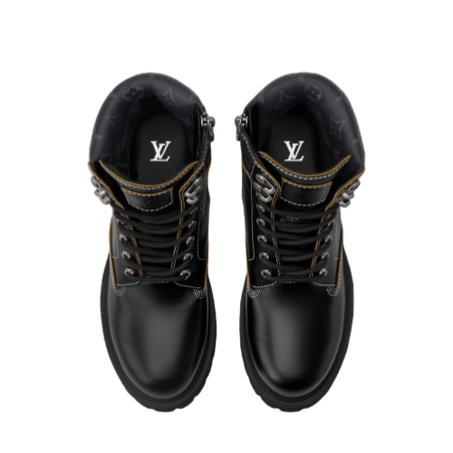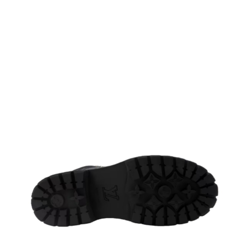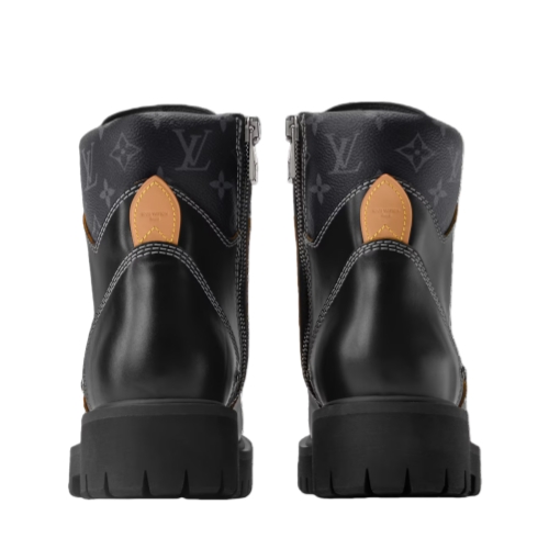 The LV Remix combat boot combines fashion and functionality with its refined upper and rugged rubber outsole. The upper, in smooth calf leather with Monogram trim, features contrast stitching and emblematic details, such as the leather pull at the back, inspired by Louis Vuitton leather goods. Silver-toned studs and Monogram Flower-shaped eyelets further elevate this design.