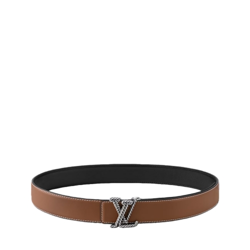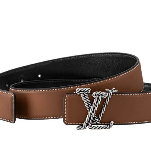 The LV Rope 35mm Reversible belt stands out for its unexpected yet utterly versatile buckle. Designed to look like two continuous pieces of rope, the initials immediately radiate nautical influence. The textured hardware and saddle stitching beautifully contrast the smooth leather strap, brown on one side, black on the reverse.